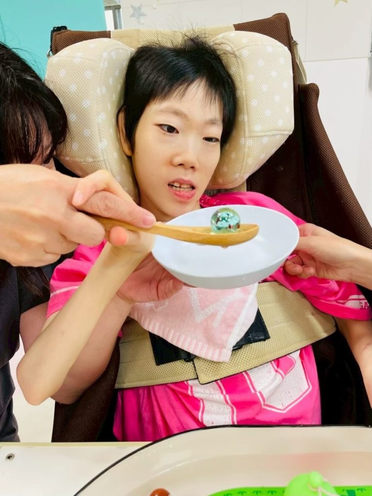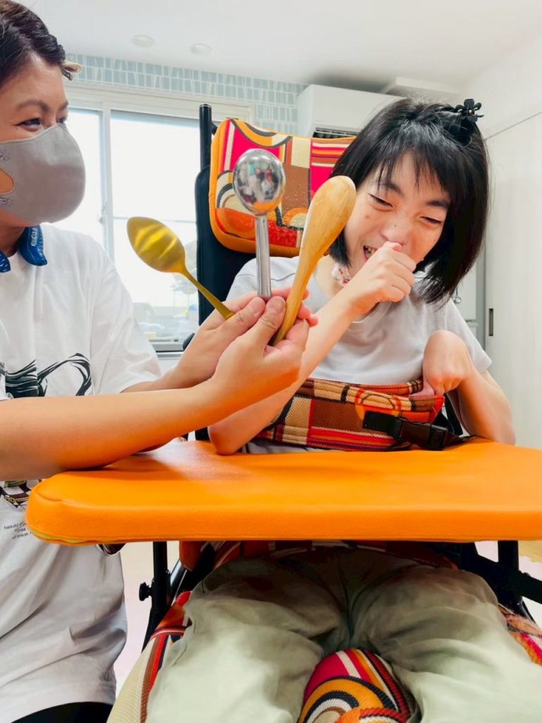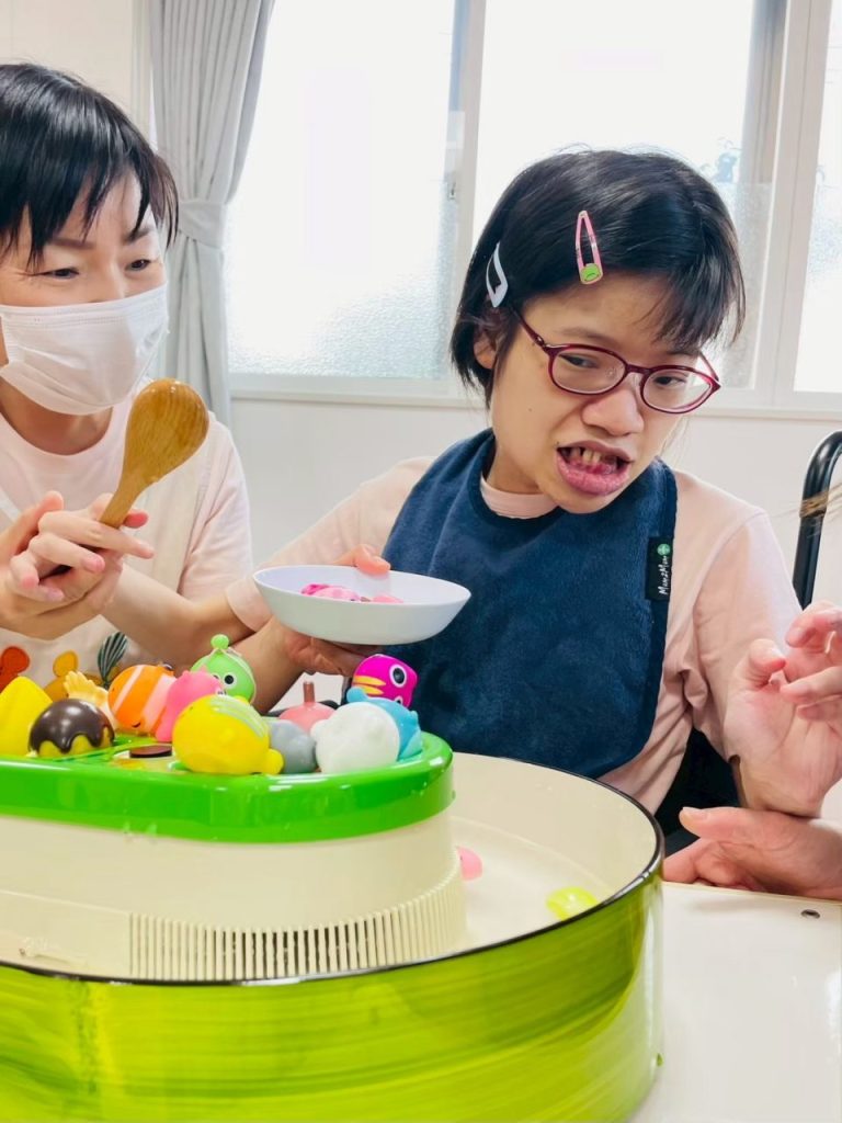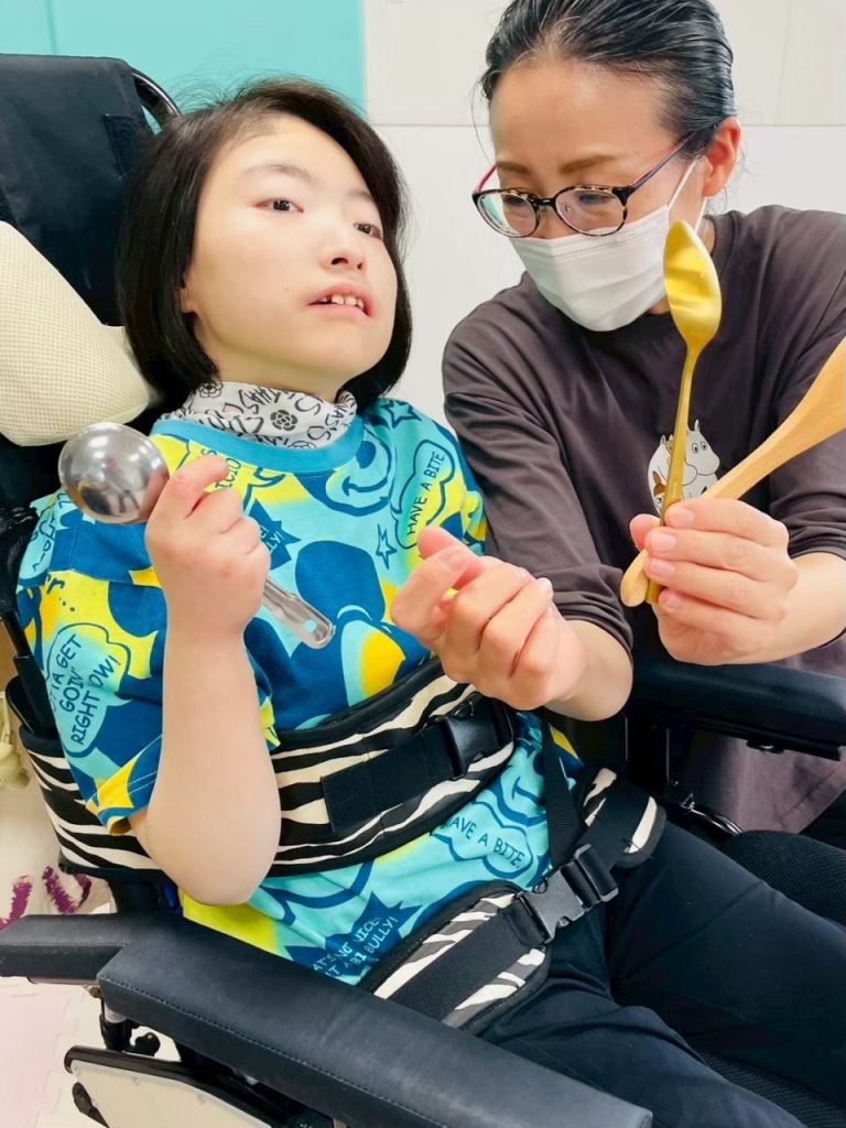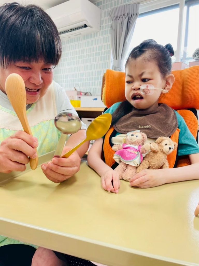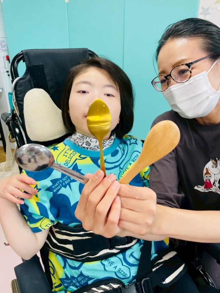〇〇ちゃんは、右手でスプーンを握りながらすくい上げて♡