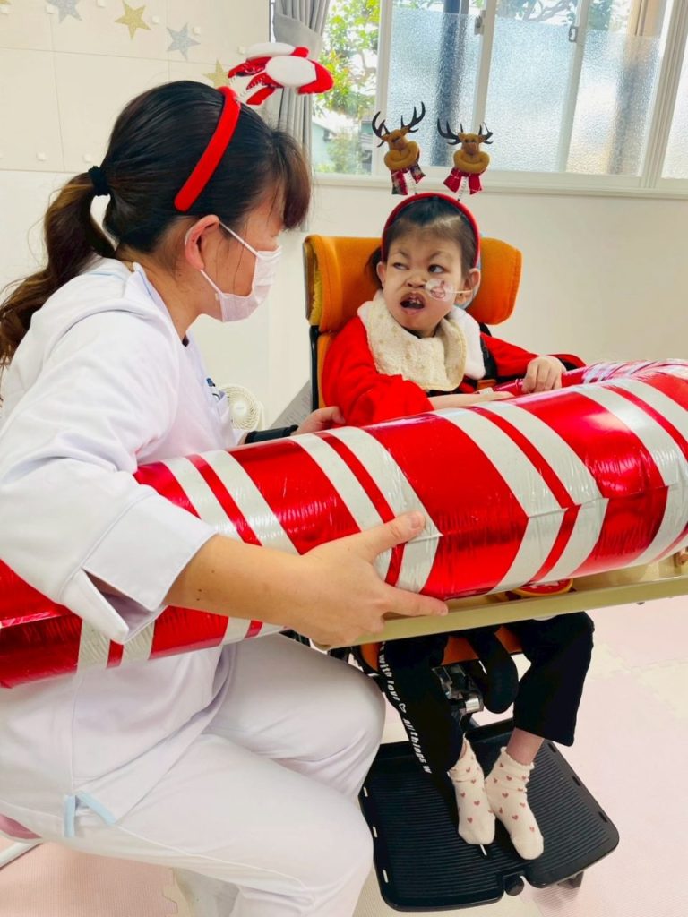 職員と声を掛け合いながらタイミングを合わせて最後までテープを巻きつけることが出来ました♡