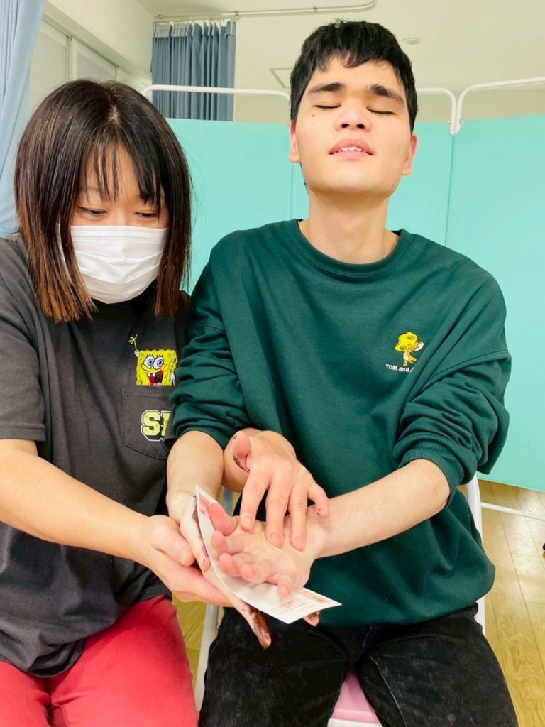 ニコニコ表情で職員と話しながら♡
