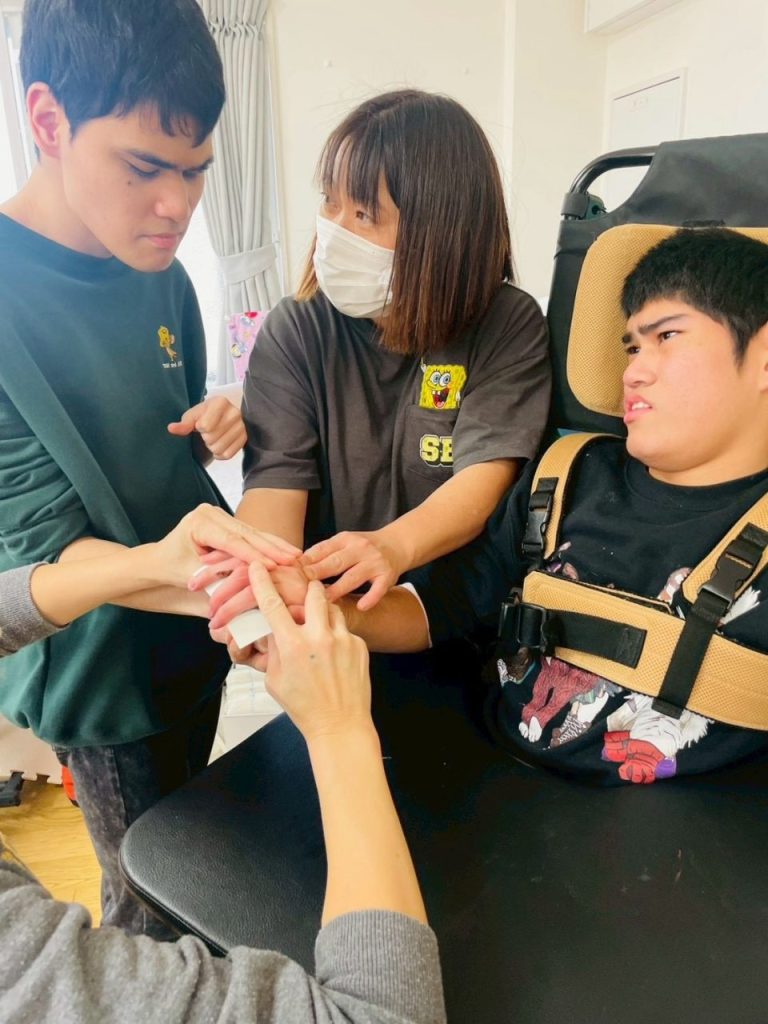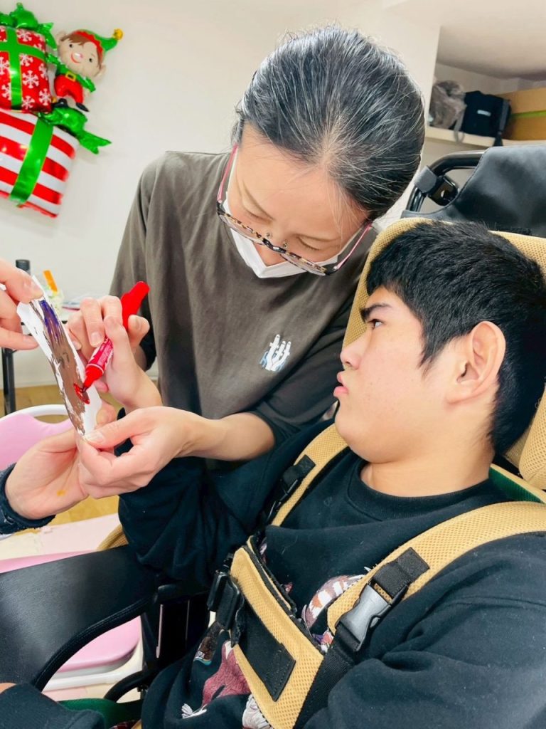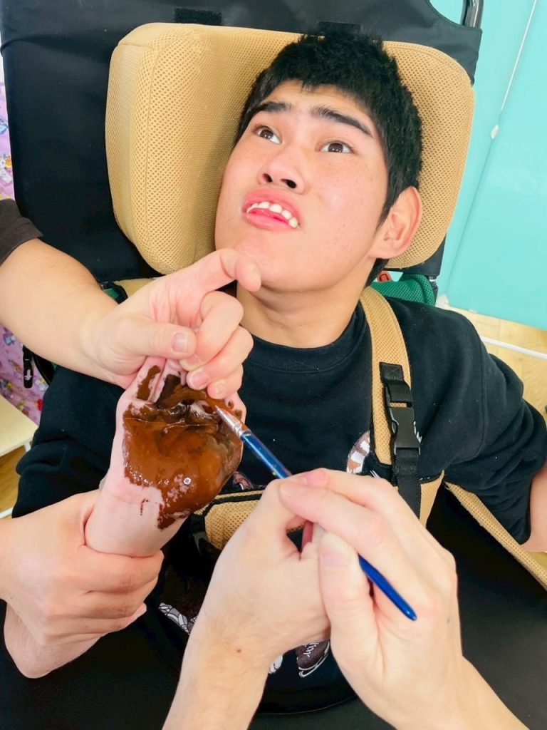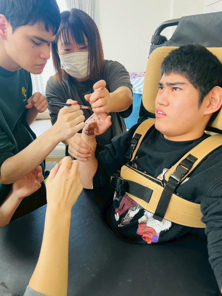 仲良しの友だちが職員と一緒に絵の具を塗るよ!