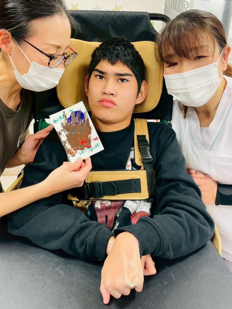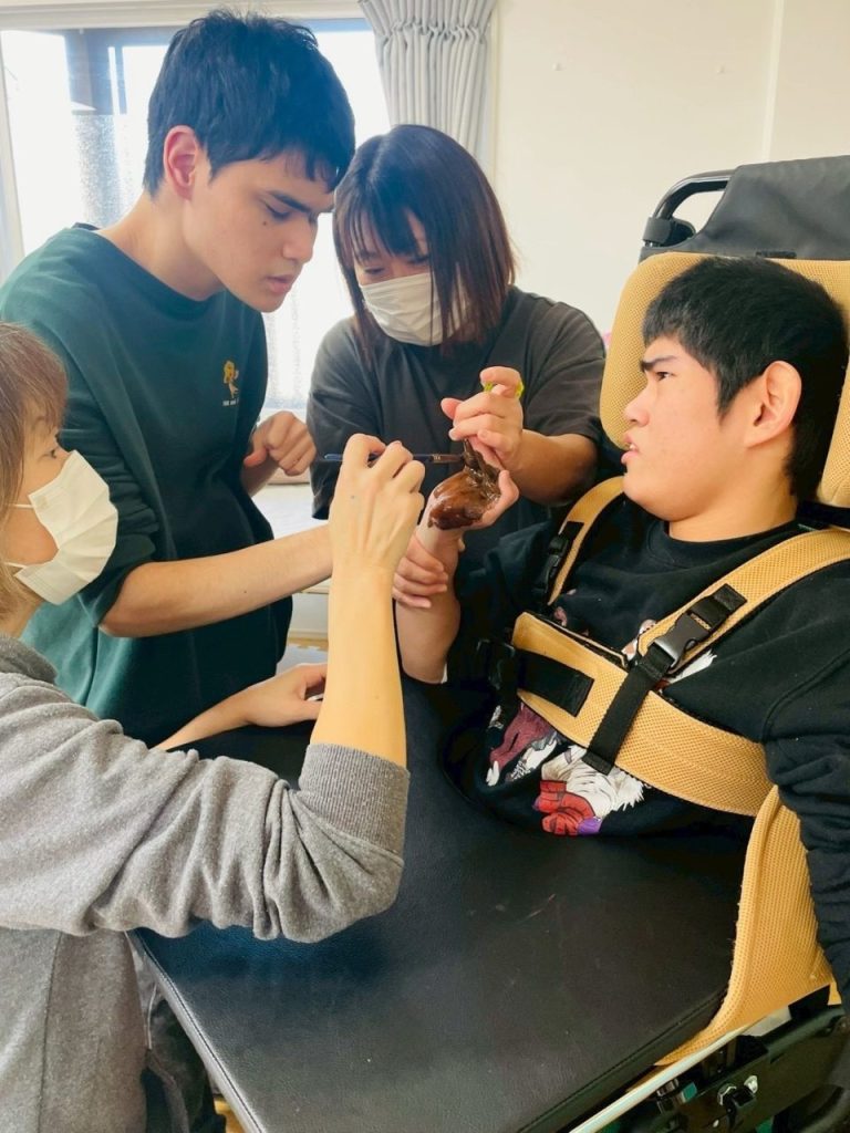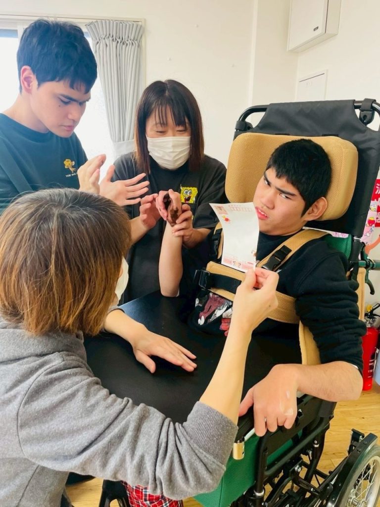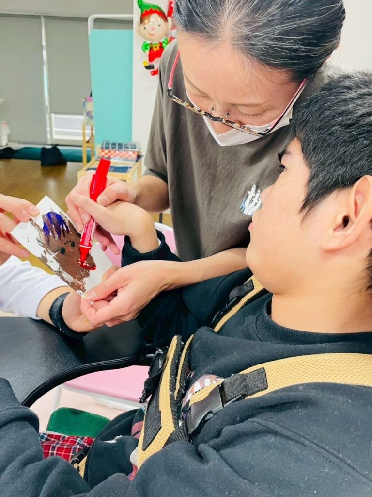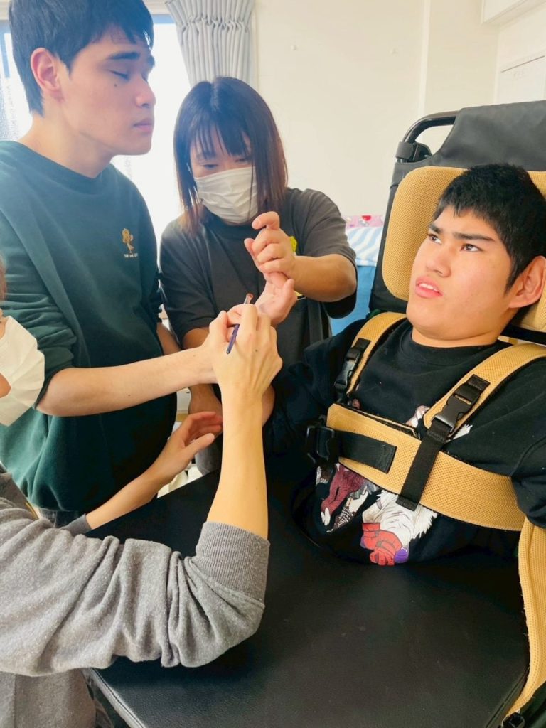 仲良しの友だちが職員と一緒に絵の具を塗るよ!