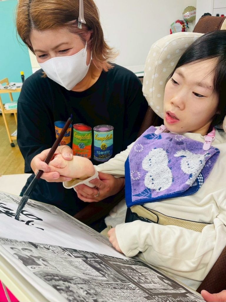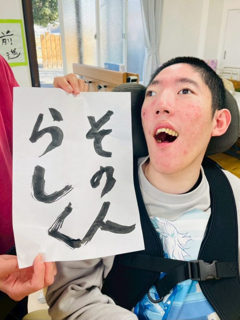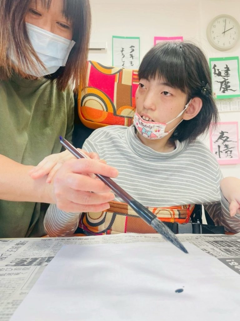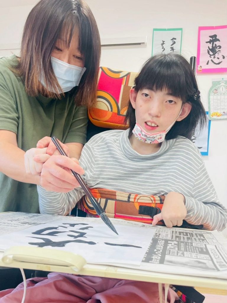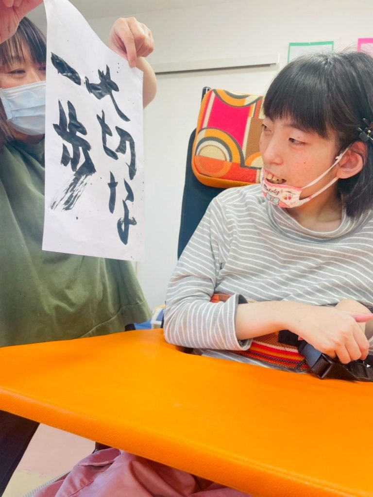 さぁ♡ 本日の活動は、成人お祝い会に向けて、ご利用者様一人ひとり「お祝いの言葉」を半紙に書きましょう。