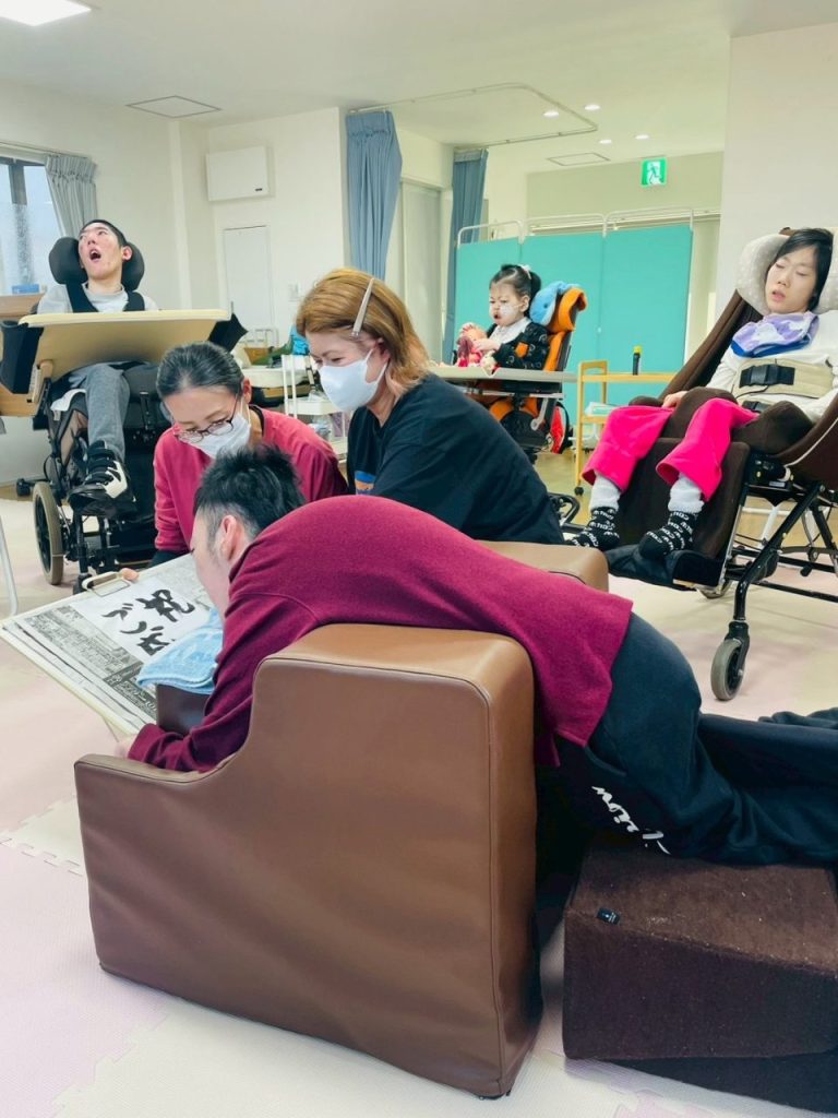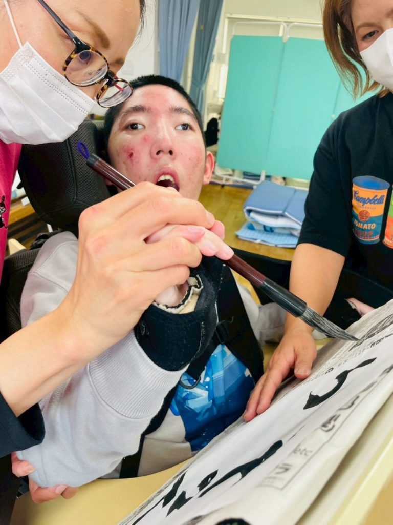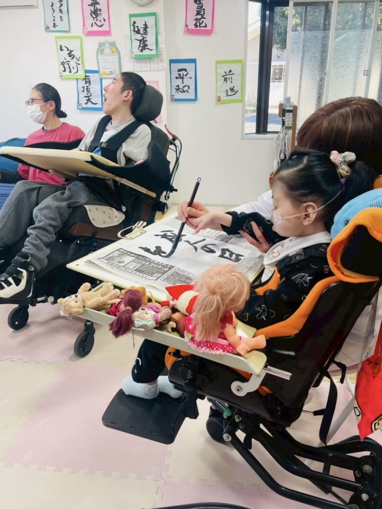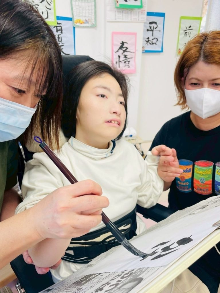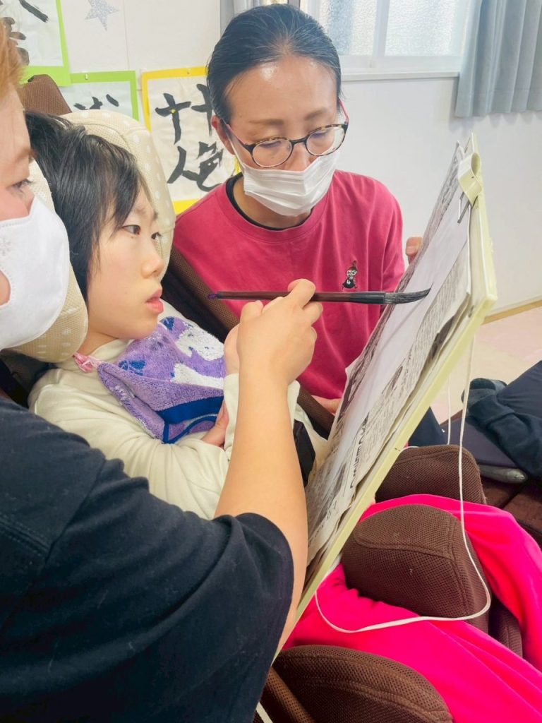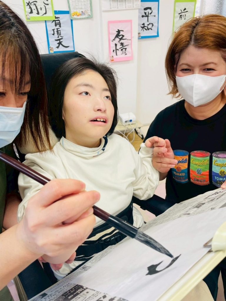 さぁ♡ 本日の活動は、成人お祝い会に向けて、ご利用者様一人ひとり「お祝いの言葉」を半紙に書きましょう。