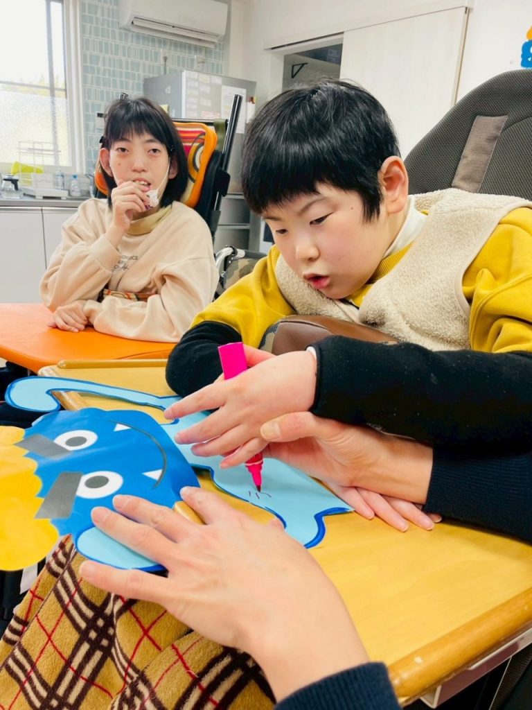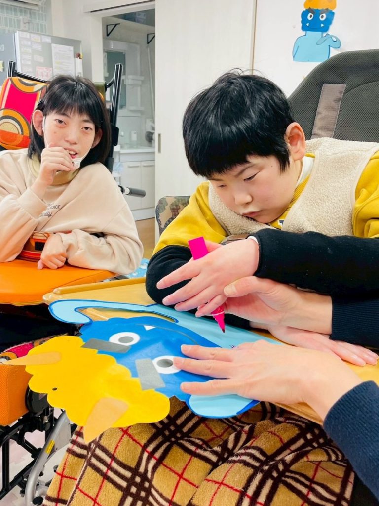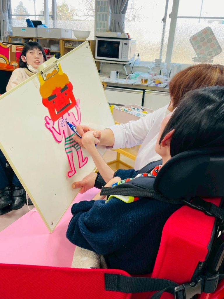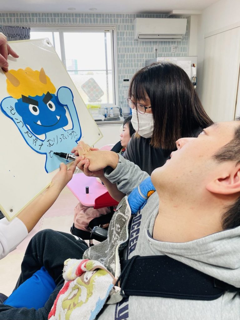 今では怖い鬼たちが貼り付けられ、ご利用者様たちをぐるりと囲んでいます。