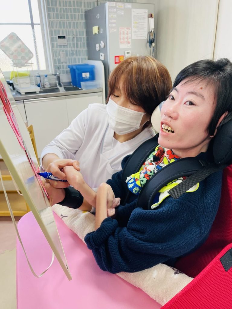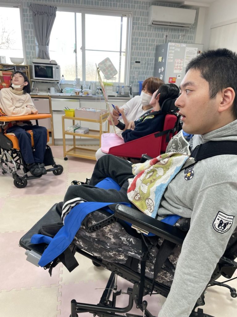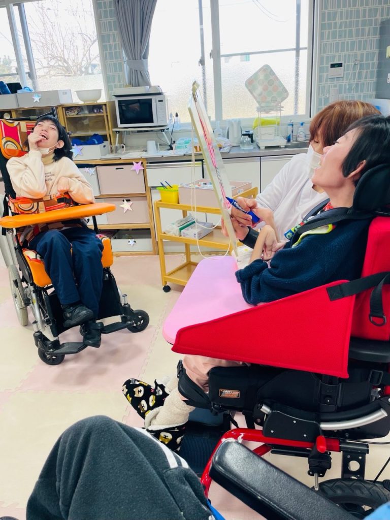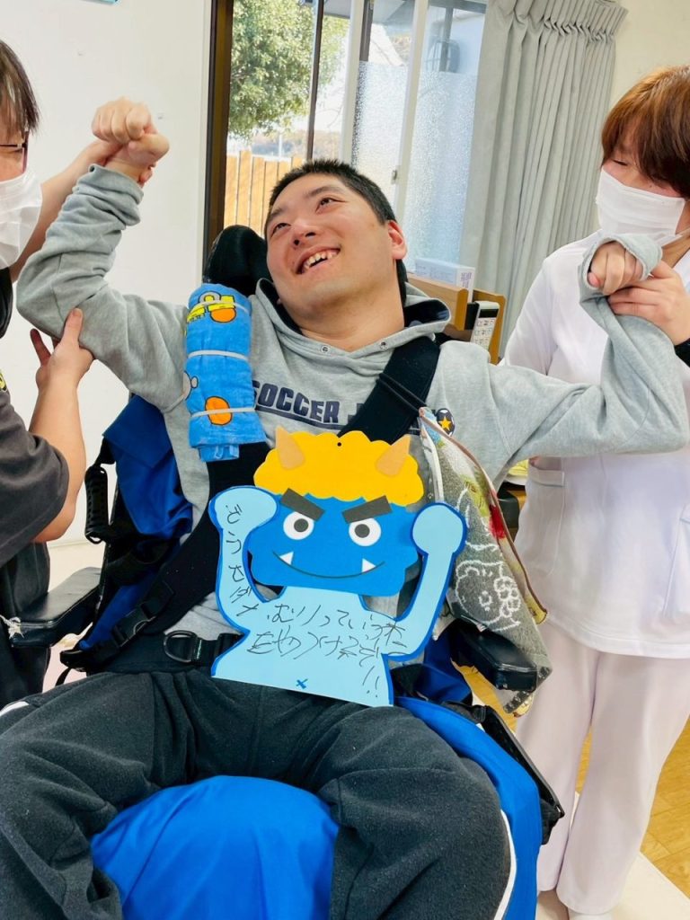 今では怖い鬼たちが貼り付けられ、ご利用者様たちをぐるりと囲んでいます。