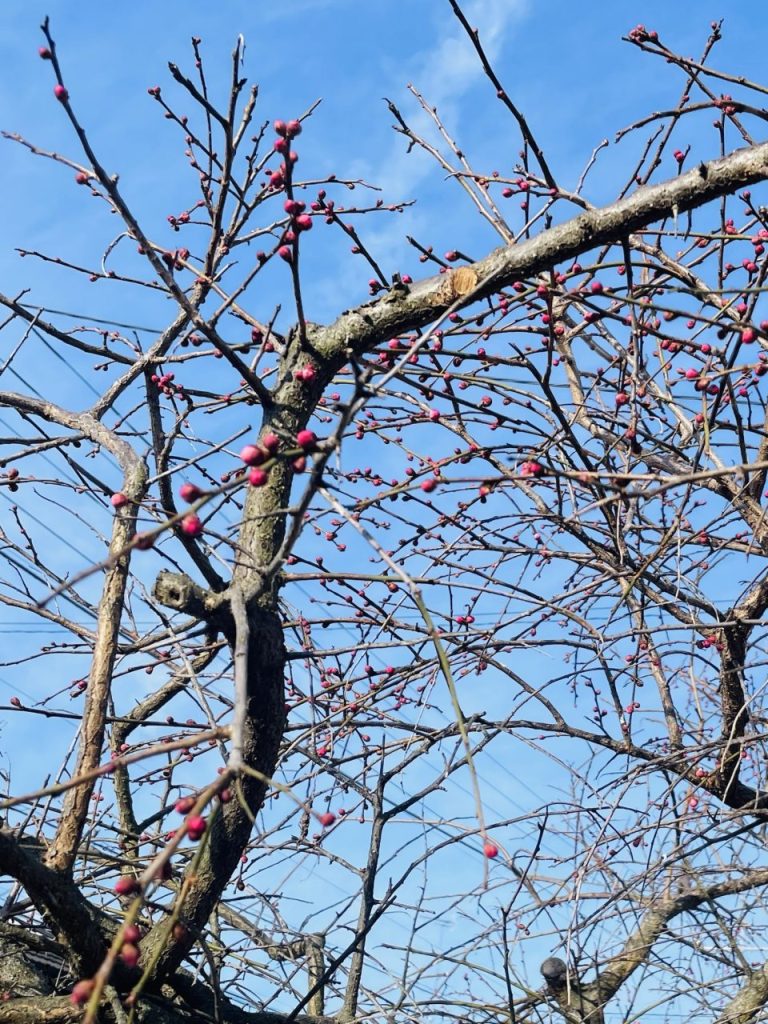 一昨日は雪が降り、冬の寒さがまだ残っていましたが、梅のつぼみは落ちることなく、枝いっぱいにぷっくりと膨らんでいました。